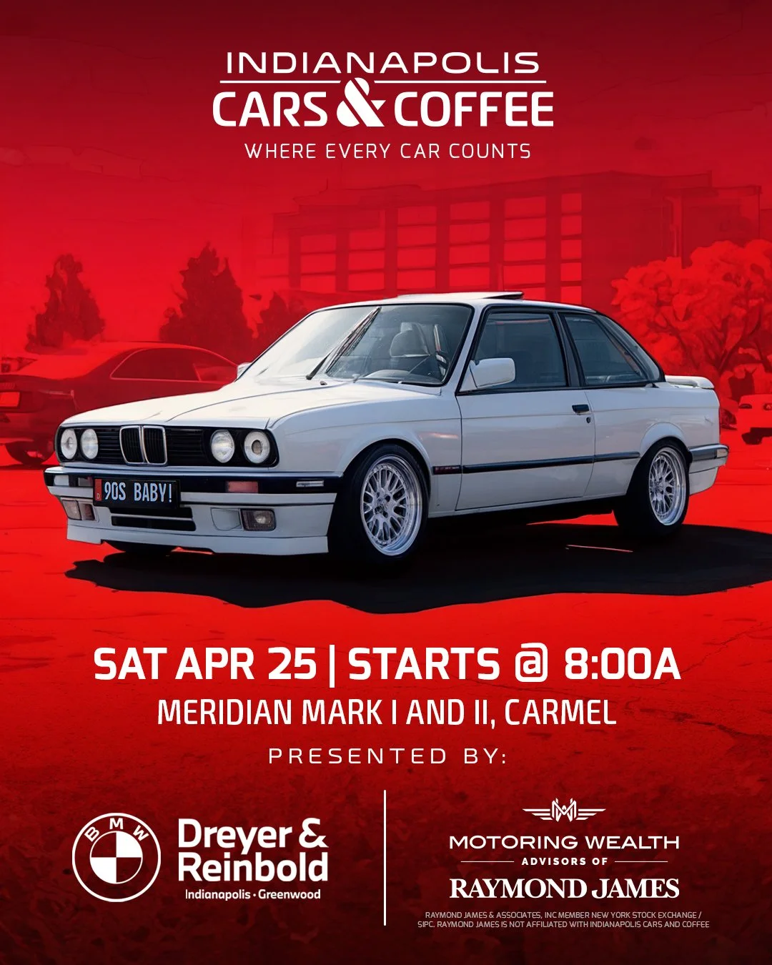 We’re kicking off Indy Cars & Coffee 2026 in Carmel, IN! Join us in April for an epic start to the season, thanks to our gracious hosts at Meridian Mark I & II — as well as our presenting sponsors Dreyer & Reinbold BMW and Motoring Wealth Advisors of Raymond James. We’re also excited to welcome BMW Car Club of America, Hoosier Chapter as our featured car club at this event.